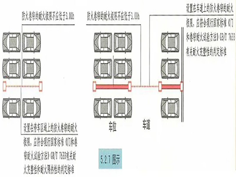 當防火卷簾的耐火極限僅符合現行國家標準《門和卷簾的耐火試驗方法》GB/T 7633有關耐火完整性的判定條件時,應設置自動噴水滅火系統保護。自動噴水滅火系統的設計應符合現行國家標準《自動噴水滅火系統設計規范》GB 50084的規定,但火災延續時間不應小于該防火卷簾的耐火極限。汽車庫、修車庫、停車場設計防火規范 GB50067-2014 5.2.7 設置在車道上的防火卷簾的耐火極限,應符合現行國家標準《門和卷簾的耐火試驗方法》GB/T 7633有關耐火完整性的判定標準;設置在停車區域上的防火卷簾的耐火極限,應符合現行國家標準《門和卷簾的耐火試驗方法》GB/T 7633有關耐火完整性和耐火隔熱性的判定標準。