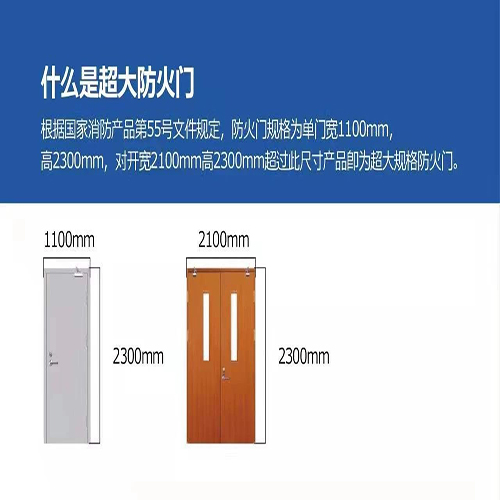 超大尺寸防火門是根據(jù)消防產(chǎn)品55號(hào)文件規(guī)定:防火門單門寬1100mm,高度2300mm;對(duì)開寬2100mm,高度2300mm。超過此尺寸產(chǎn)品,稱為超大尺寸防火門。