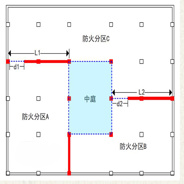 如上圖所示:防火分區C與防火分區B之間的分隔部位僅為L2,中庭部位不計算在內。則防火卷簾d2,當L2≤30m時, d2≦10m;當L2>30m時, d2≦1/3L2,,且不應大于 20m