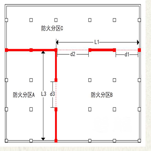 如上圖所示,防火分區B與防火分區A和防火分區C均相鄰。但是防火分區B與防火分區C和防火分區A的分隔部位寬度分別為L1和L3,不應相加計算。其防火卷簾寬度需要分別在相鄰兩個防火分區處滿足規范要求。例如在L1處時,防火卷簾寬度為d2+d1,相對L1滿足規范要求。